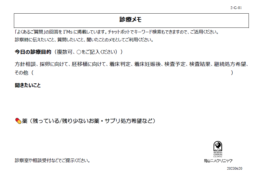 そのようなことを防ぐために、1階・2階の待合に設置している診療メモをご利用ください。あらかじめ伝えたい内容を整理し、診察室に入った時に提出してください。