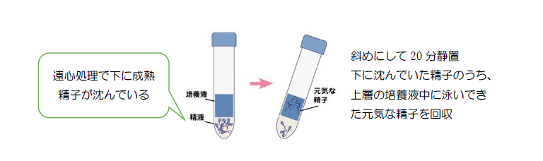 人工授精と同様の密度勾配遠心法の後、スイム・アップ法でより少数精鋭の精子のみを集めます。