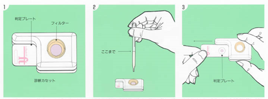 アルミ袋からカセットを取り出し、スポイトの線まで尿を吸い、フィルターに滴下します。このとき、一滴ずつ染み込むのを待つのではなく、一気にフィルターにのせてください。