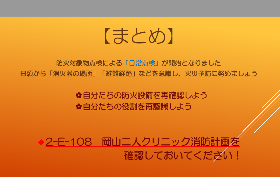 特定1階段防火対象物に対する規制強化により、防火対象物点検が義務化されています。当クリニックでも必要な設備の設置は完了していますが、4月より防火対象物の点検を職員全員で行う事としました。